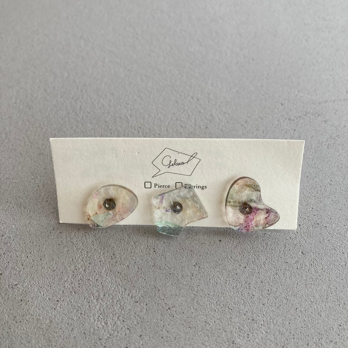 一枚板に手描きでペイントを施し、ひとつずつカットしたパーツは全て一点物で光の反射などで見え方も様変わりするアートを切り出しうまれる唯一無二のアクリルアクセサリーです。ショーケースの中にたくさん並んでいるジェラートたちから今日はどれにしよう。って幸せな時間を味わうように、自分だけの一点物アクセサリーを選んでみませんか?