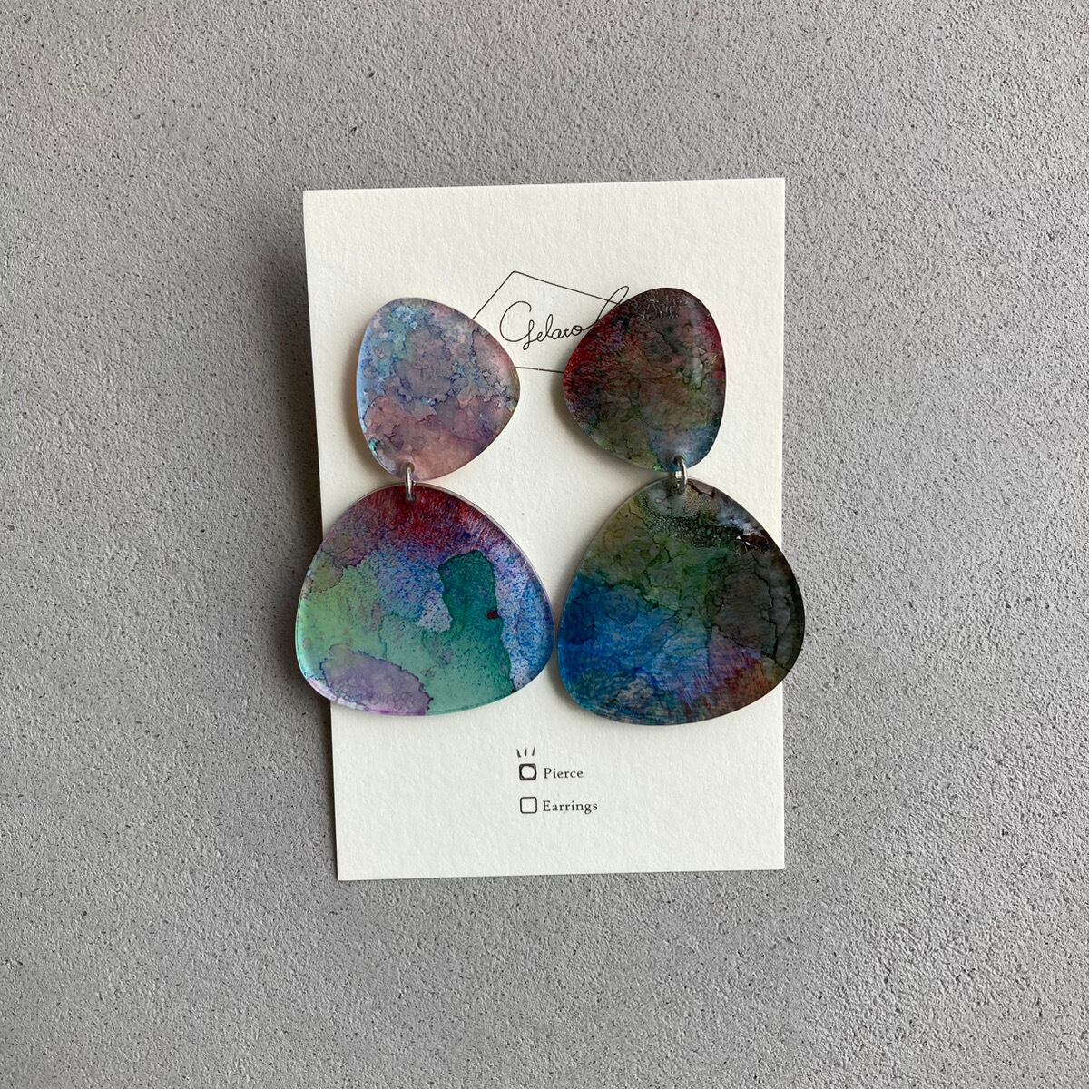 一枚板に手描きでペイントを施し、ひとつずつカットしたパーツは全て一点物で光の反射などで見え方も様変わりするアートを切り出しうまれる唯一無二のアクリルアクセサリーです。ショーケースの中にたくさん並んでいるジェラートたちから今日はどれにしよう。って幸せな時間を味わうように、自分だけの一点物アクセサリーを選んでみませんか?